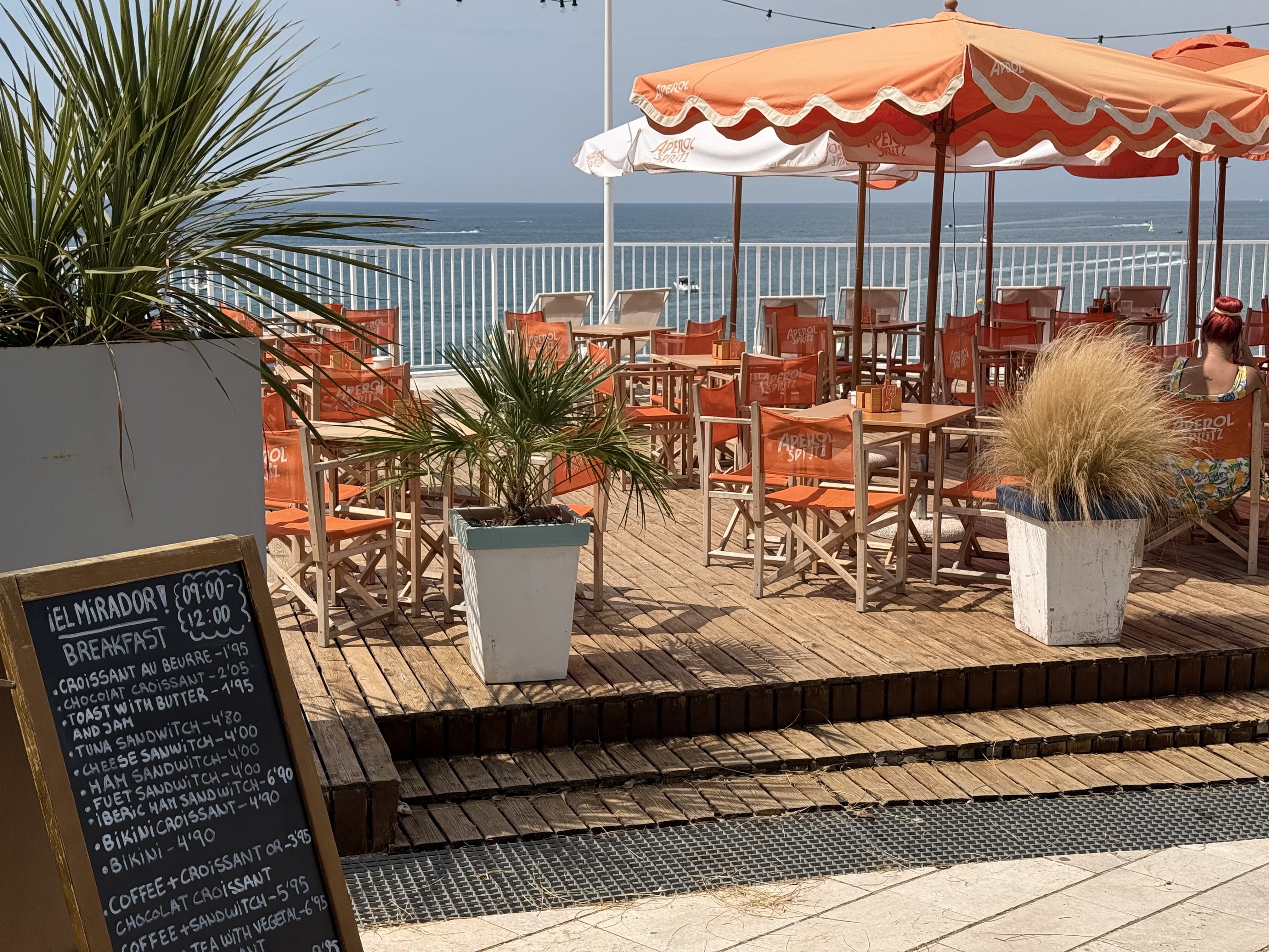On the other hand, if you on holiday are more likely to be rolling out of bed at a far more leisurely pace, meet up with your early-worm friends for breakfast at a chiringuito. Xiringuito Mirador has breathtaking views of the ocean, fine breezes, and shady umbrellas. Don’t expect quick service here: I think this is the open bar of the Vivero Beach Club downstairs, where their attention is actually focused. The view is worth the unhurried pace. A fine late breakfast might include a Cafè amb leit — coffee with milk — fresh juice, and some of the best bread for great breakfast sandwiches in town. You’ll also find pastries and yogurts with fruit — they switch to more savory plates and seafood by lunch.